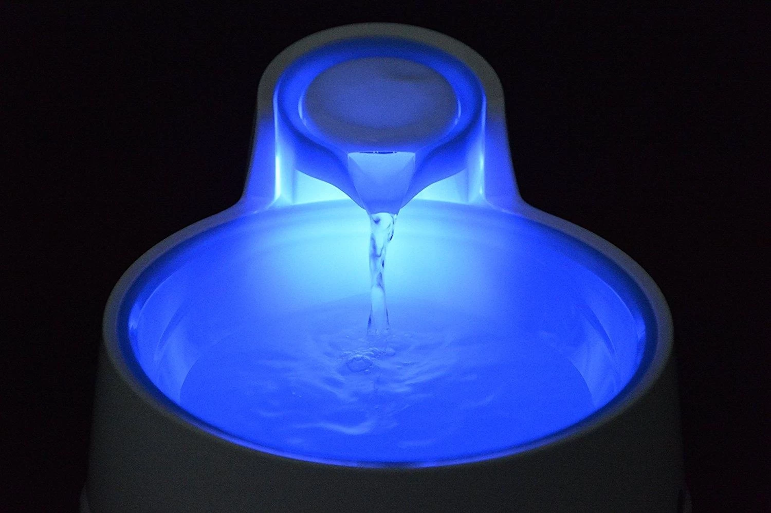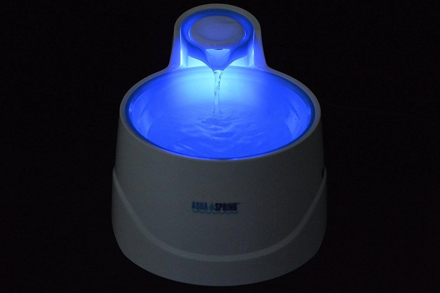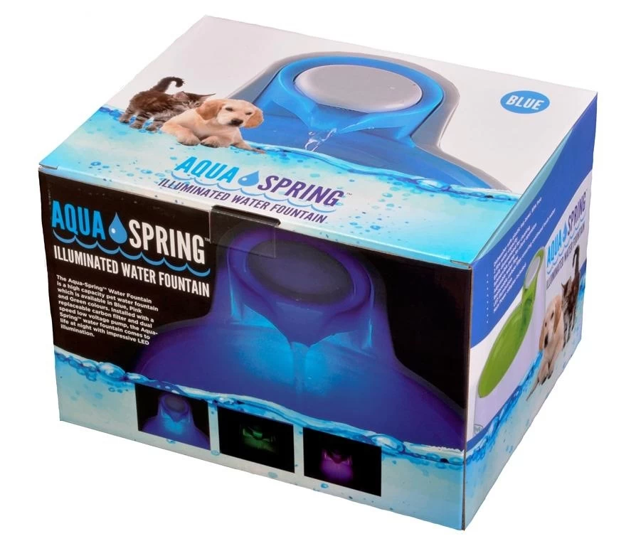 The AquaSpring LED illuminated Pet Water Fountain from PJ Pet Products is a 2 litre high capacity water fountain for both dogs and cats and is available in three colours, Blue, Pink and Green. The AquaSpring water fountain is supplied with a carbon filter which is replaceable. This ensures that your pet is always offered clean water which helps with proper kidney function and prevents crystal formation that can lead to urinary diseases. Please change once a month. The AquaSpring fountain is fitted with a 2 speed pump that allows adjustment of the water flow to suit, is super silent when running and is easily assembled and disassembled for cleaning purposes. The bowl which is removable is dishwasher safe and BPA free. The AquaSpring LED Illuminated Pet Water Fountain comes to life at night with impressive illumination! Supplied with UK and EU mains adaptors. Product dimensions: 25cm x 20cm x 18 cm. Product weight: 971g.