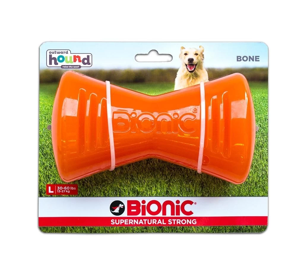 The Bionic Bone is made from a propriety Bionic Rubber material which is 100% recyclable, FDA approved and dishwasher safe. Also Lead, BPA and Phthalate Free. The Bionic Bone can be filled with treats and has thick ridges on chew points to stimulate your dogs senses.  So along with all these great benefits its also as ‘tough as old boots’ and makes a fantastic chew toy. Size large – recommended for dogs 30-60lbs.