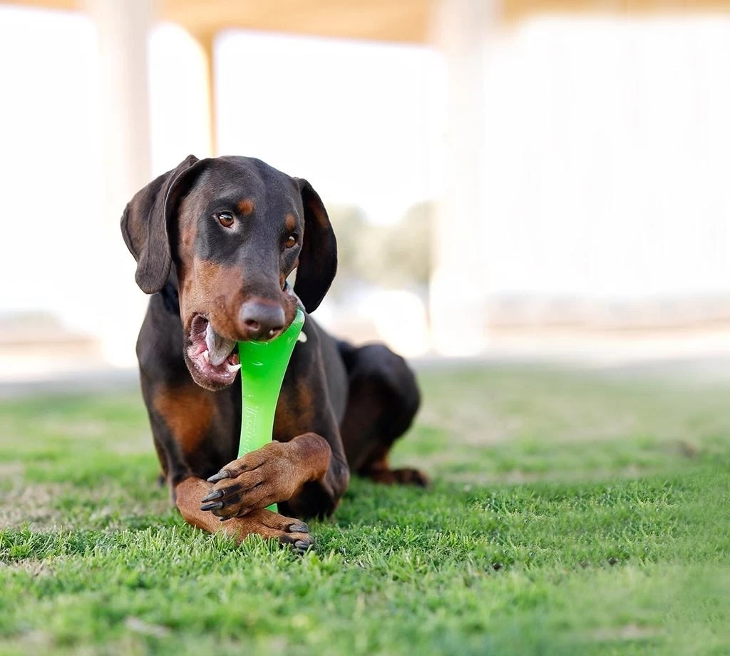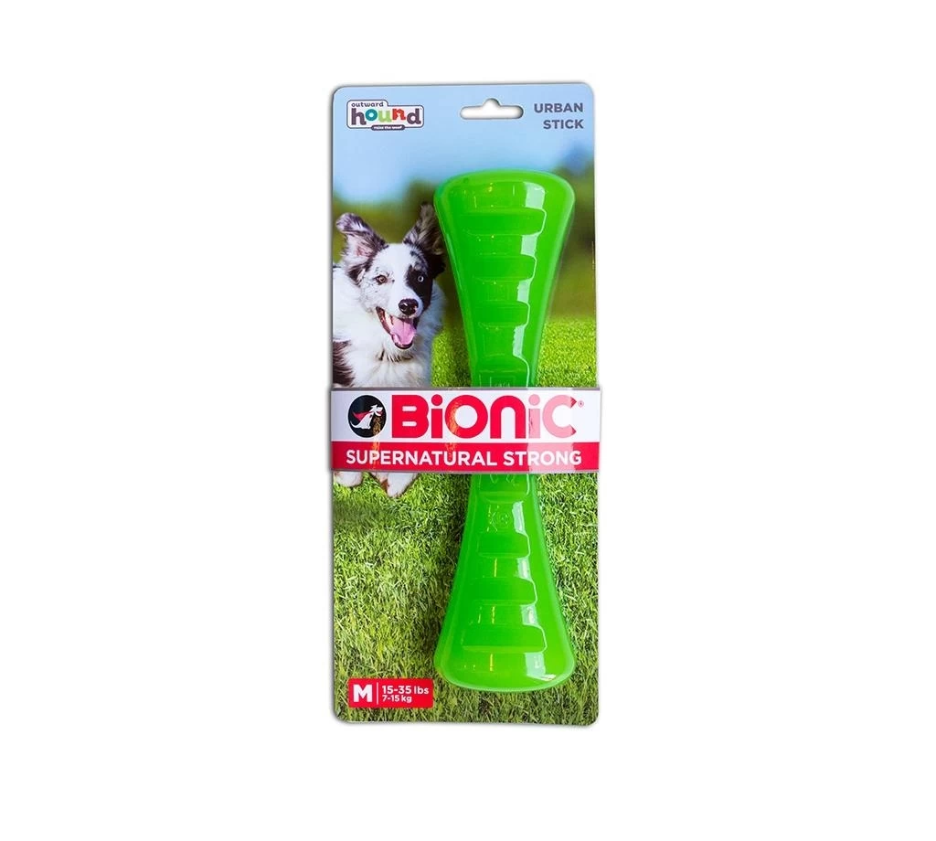 The Bionic Stick is made from a propriety Bionic Rubber material which is 100% recyclable, FDA approved and dishwasher safe. The Bionic Urban Stick has been designed and manufactured to fit the natural curvature of a dog’s mouth and has ridges along the top of the stick to make it feel as though the toy is being chewed through. The Urban Stick is also perfect for a game of throw and fetch and has weights at both ends to create a spiralling effect when moving through the air.  You can also fill it at each end with your dogs favourite treats or food to make play time even more exciting. It also floats in water! So along with all these great benefits it is also as ‘tough as old boots’ and makes a fantastic chew toy. The Bionic Urban Stick gives hours of super fun!