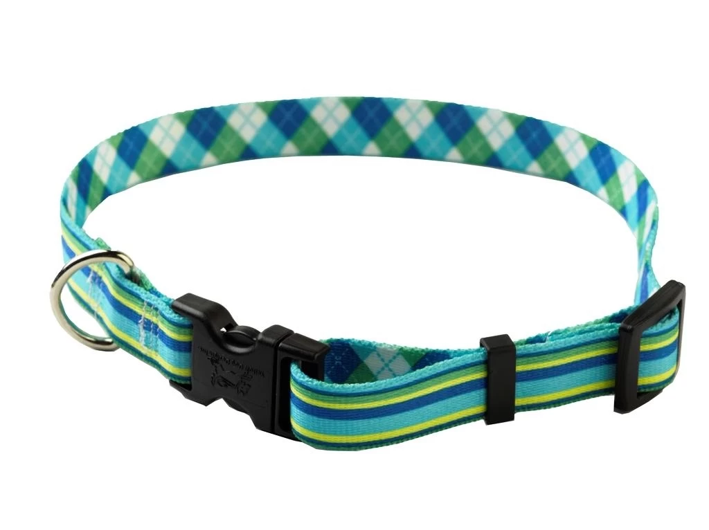 Argyle isn’t just for the golf course any more. This trendy collar from Yellow Dog Design comes in great shades of blue and green.  A striped exterior and an argyle print to the interior lining.  Your pooch can enjoy the latest in four-legged fashion! Made from 100% polyester and fully washable, it’s easy to keep this collar looking fresh and clean, even for the muckiest of pups! Featuring durable plastic buckles, adjustable slip locks and a silver-look metal D-ring, it’s simple to clip onto any complementary lead in our Yellow Dog Design range – perfect for fashionable walks in the country or around town.