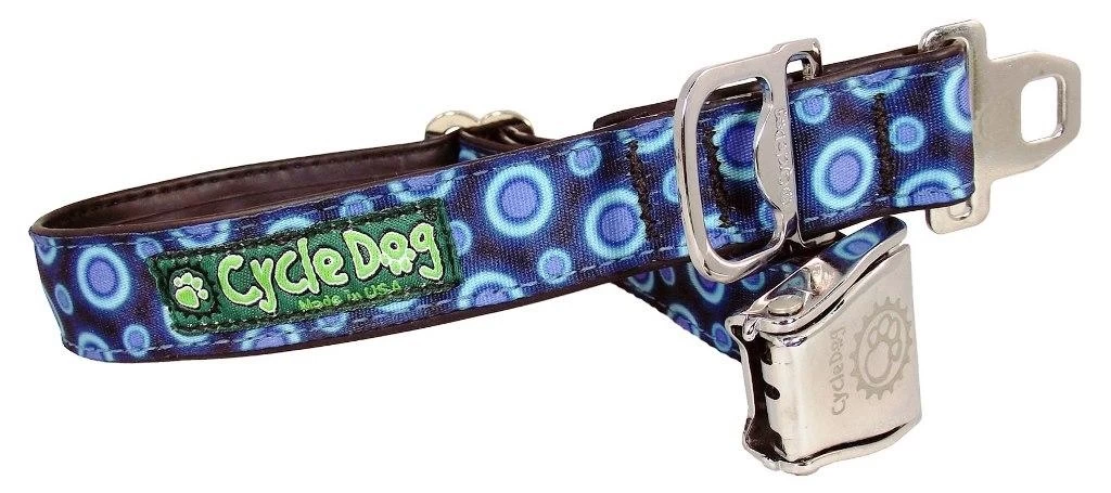 The No Stink, Anti-Bacterial Dog collar in this far out Blue Space Dots pattern is made from recycled inner bicycle tubes. Â The reclaimed rubber is hand sewn onto the back of the fabric which then prevents bacteria from growing, the collar from becoming sticky and also stinky! Added features on the collar include a Latch-Lock metal buckle fastener, an ID Spot Loop Attach, a handy Pup Top Bottle Opener & a lead attachment. A matching lead in this range is also available. Collar available in two sizes.