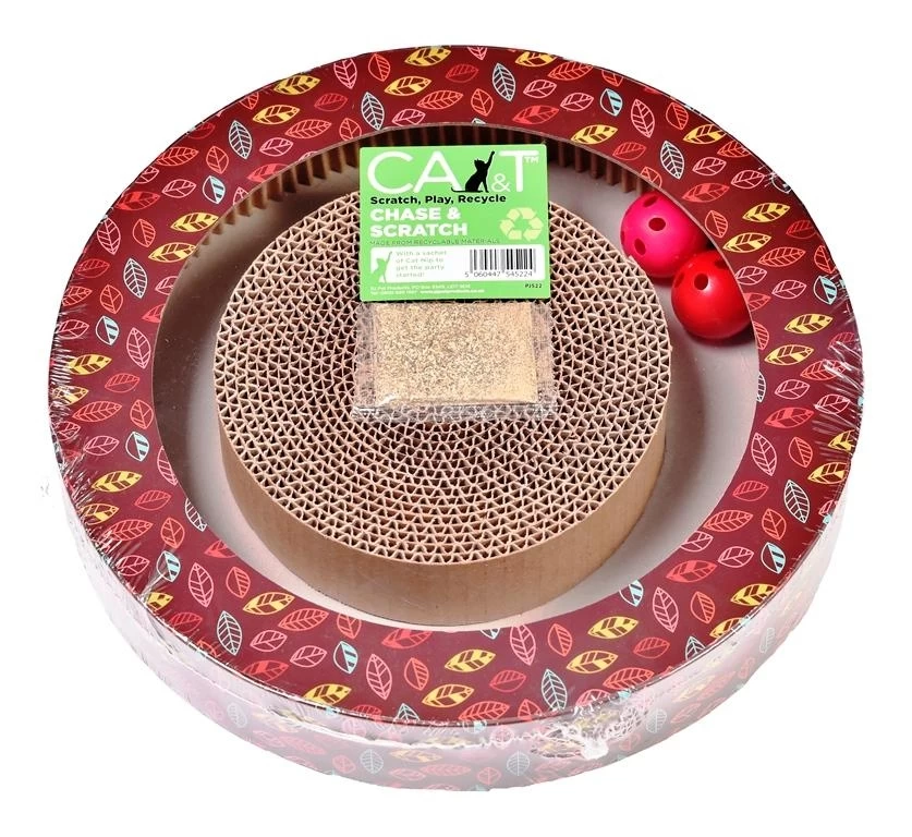 Made from recyclable materials, the Chase & Scratch from CA&T allows your Cat to freely paw at the interactive toy chasing the ball in the track that runs around the entire edge of the game. The Chase & Scratch Interactive Cat toy also has a scratch pad top to add to the entertainment.  A sachet of Cat Nip is included to get the party started! This interactive game is 100% recyclable. Mi-Wow!