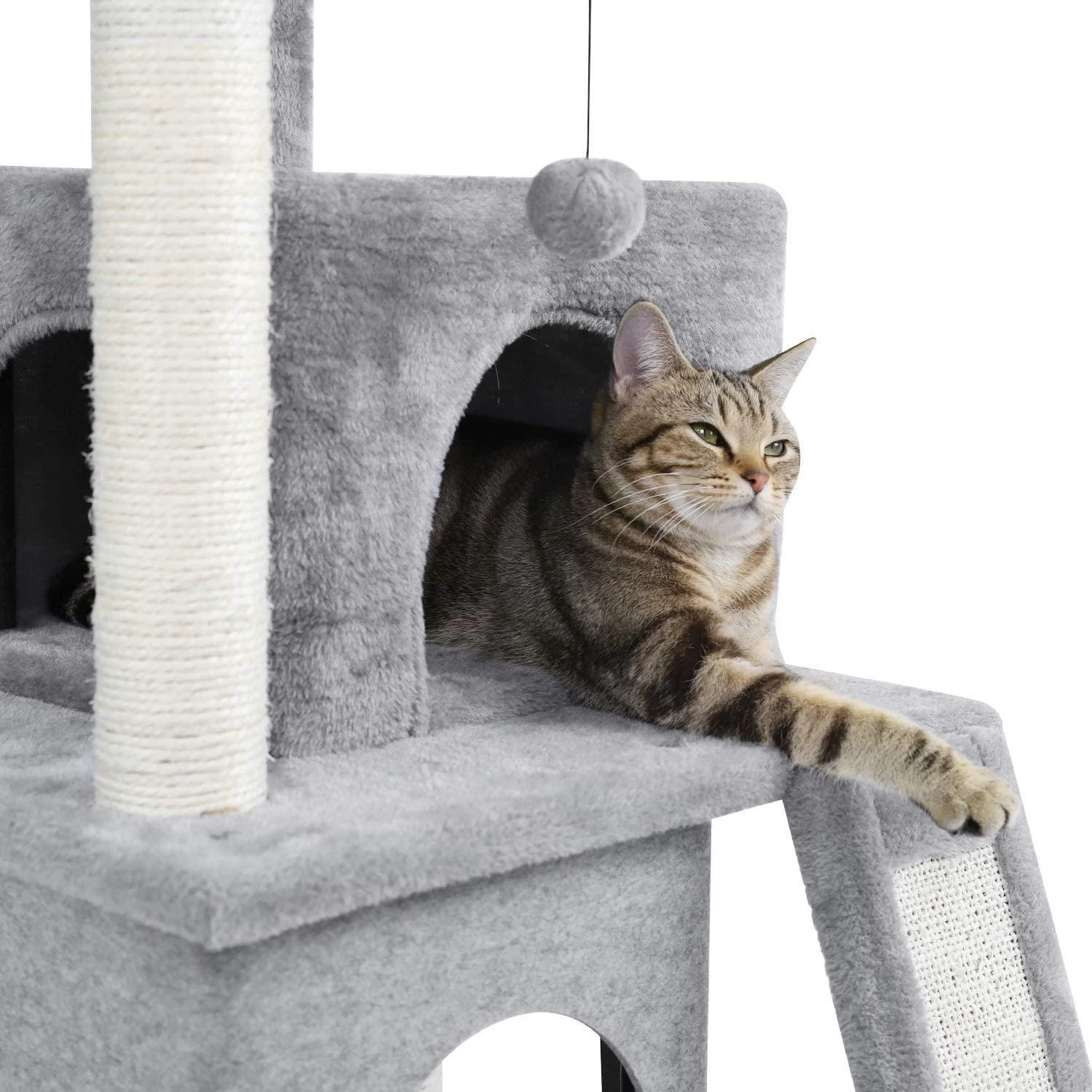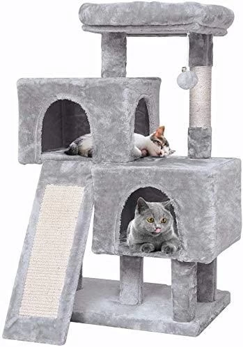 The CA&T Ultimate Cat Condo & Scratcher is mid-sized making it perfect for a multi-cat family with limited space. There are two multi-level covered condo caves with one having access via a fixed scratch board doubling as a stairway plus a cosy top perch with super soft padded sides. Completing the CA&T Cat Condo & Scratcher is a fluffy fur pom pom to ping and play with which is attached to the underside of the top perch. Made from high quality, environmentally friendly, non-toxic particle board covered in 400g faux fur soft plush in a grey colour material, the upright post & scratch board are covered with top quality 4mm natural sisal which is great for sharpening those claws! Durable and sturdy, when constructed the CA&T Ultimate Cat Condo & Scratcher is approximately 96cm H x 55cm W x 40cm D in size. Supplied with installation instructions and fixings. Weight approximately 12 kgs.