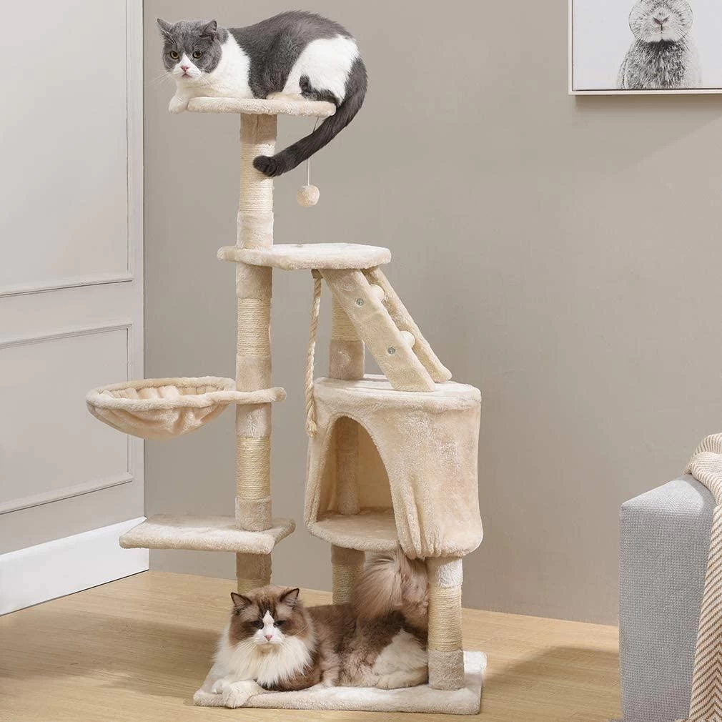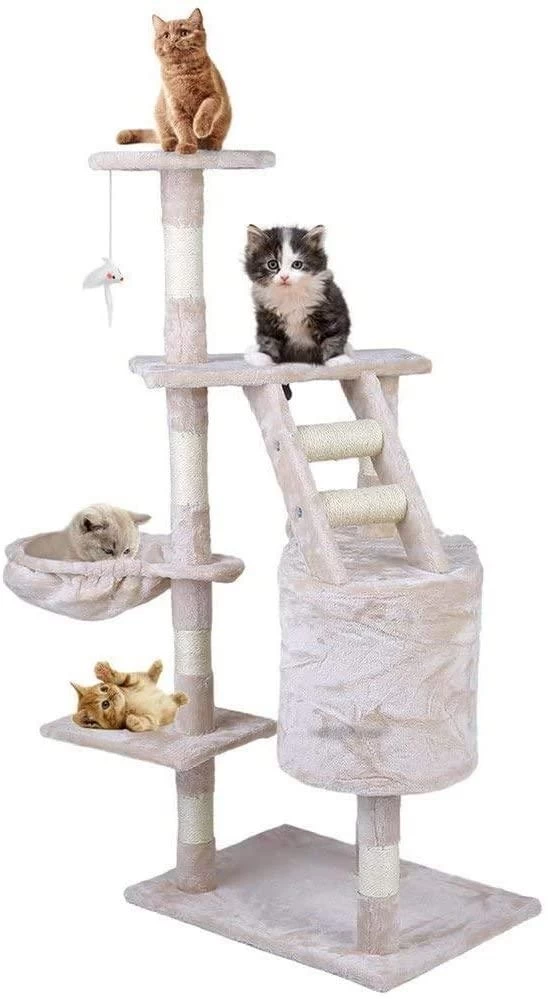 The CA&T Ultimate Condo Hammock Scratch Tree is an intermediate sized cat haven comprising of multiple platforms, built in staircase, a tower perch, hammock and a super snug covered condo hide-away.  To complete there is a chunky rope which hangs down centrally from the underside of the mid-way platform to playfully tantalise your kitty cat! Made from high quality, environmentally friendly, non-toxic particle board covered in 350g faux fur soft plush beige colour material, the upright posts are partially coiled with top quality 4mm natural sisal which is just great for sharpening those all-important pussy cat claws! Durable and sturdy, when constructed the CA&T Ultimate Condo Hammock Scratch Tree is approximately 125cm H x 48cm W x 35cm D in size. Supplied with installation instructions and fixings. Weight approximately 8.5 kgs.