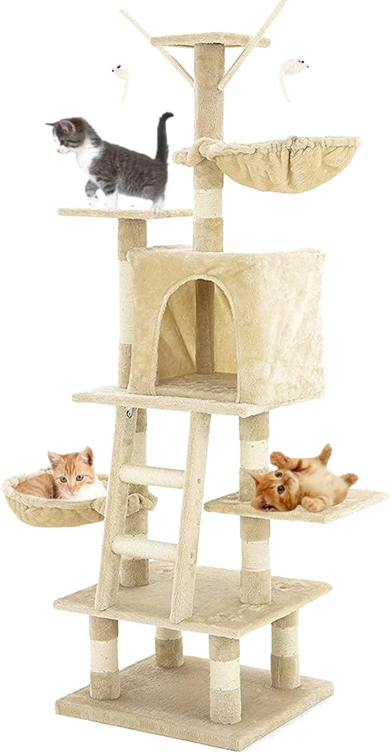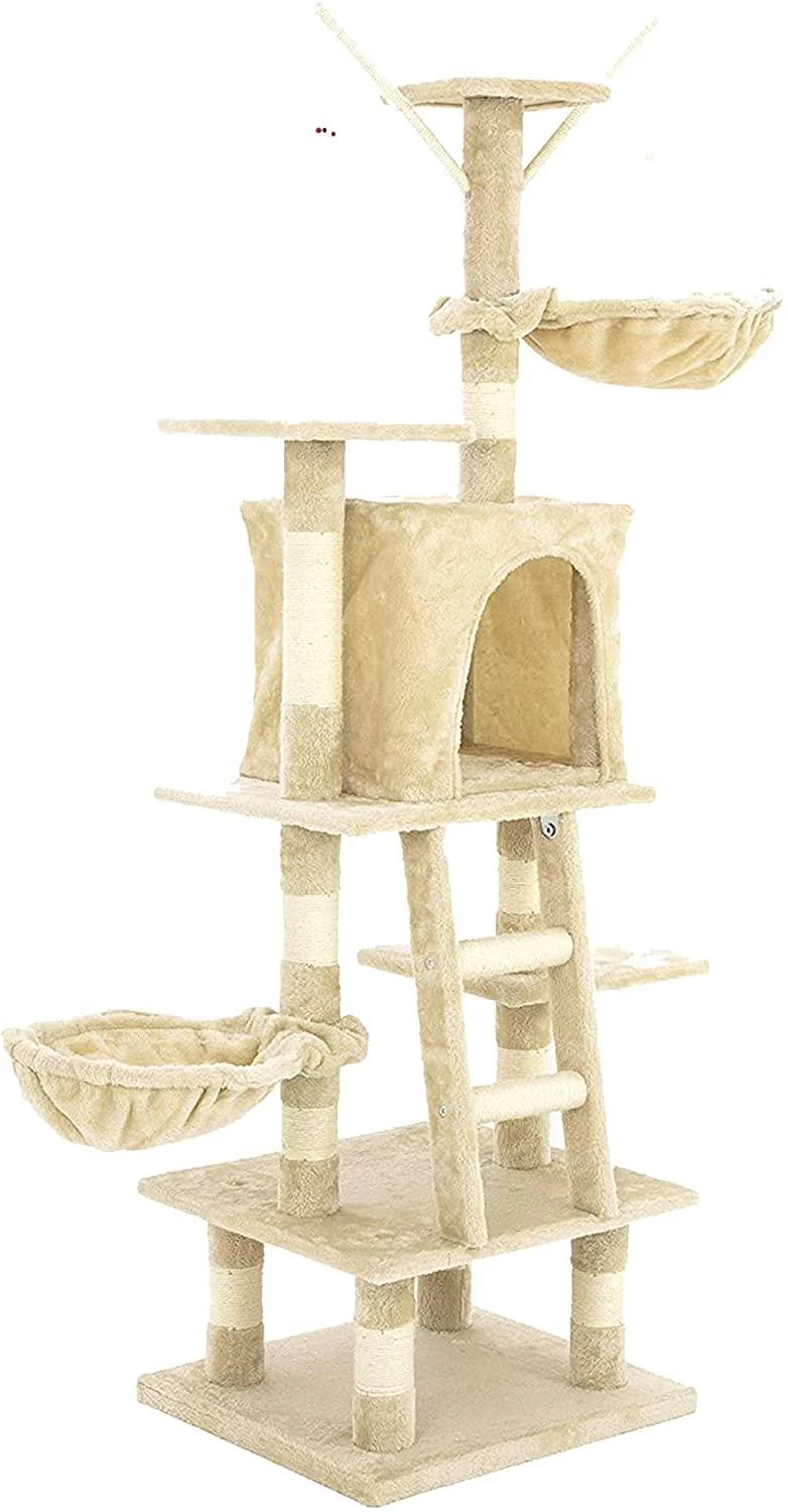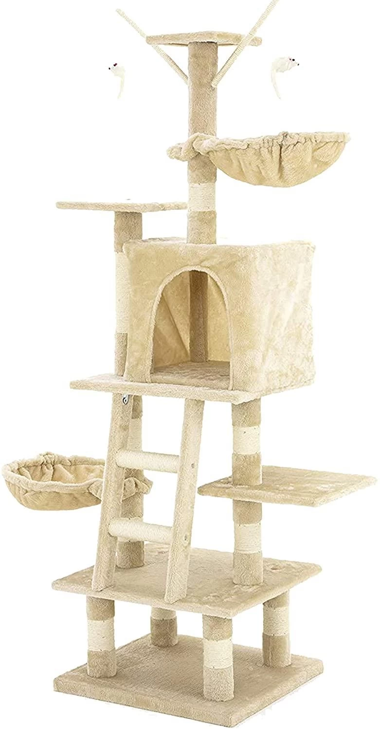 The CA&T Ultimate Lazy Boy Scratching Tree is just a sleeping and playing bonanza for your furry feline! Consisting of a double base, four post supported, access to the main scratching tree is via an integral ladder to two raised platforms, a top perch, two hammock beds not to mention a super-sized covered condo sleep hide-away! This mid-sized cat tree is completed with two furry mice on elastic attached to the top platform to keep your cat entertained. A total kitty cat heaven. Made from high quality, environmentally friendly, non-toxic particle board covered in 350g faux fur soft plush in a beige colour material, the upright posts are partially coiled with top quality 4mm natural sisal which is great for sharpening those claws! Durable and sturdy, when constructed the CA&T Ultimate Lazy Boy Scratching Tree is approximately 158cm H x 91cm W x 45cm D in size. Supplied with installation instructions and fixings. Weight approximately 13 kgs.