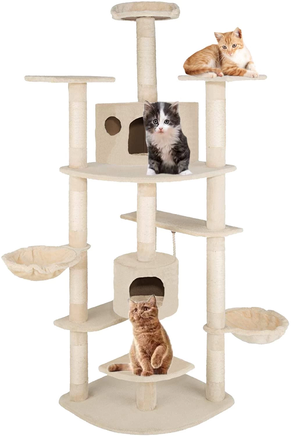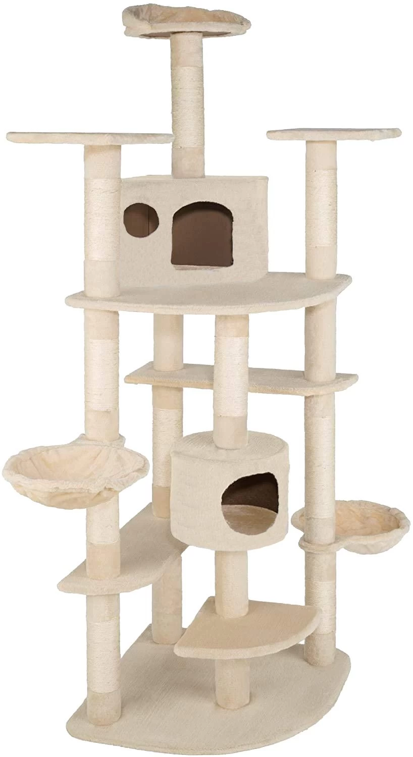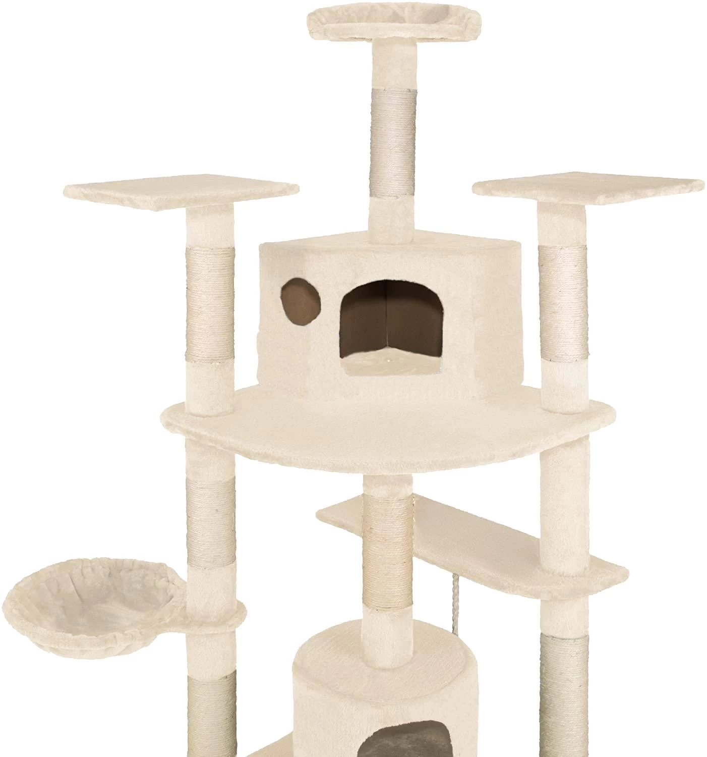The CA&T Ultimate Luxury Mega Climber & Scratcher is a giant at 200cm in height making it the tallest in CA&T cat furniture range and perfect for a multi-cat family. This monster is multi-level, has four raised platforms, two hammock beds, one small and one large covered condo sleep pods and three perches, one backed for extra support. Completing the CA&T Ultimate Luxury Mega Climber and Scratcher is a chunky rope which hangs down from the underside of the mid-way platform to the right playfully tantalising your kitty cat! Made from high quality, environmentally friendly, non-toxic particle board covered in 400g faux fur soft plush in a beige colour material, the upright posts are partially covered with top quality 4mm natural sisal which is great for sharpening those claws! Durable and sturdy, when constructed the CA&T Ultimate Luxury Mega Climber & Scratcher is 200cm H x 58cm W x 58cm D in size. Supplied with installation instructions and fixings. Weight approximately 19 kgs.