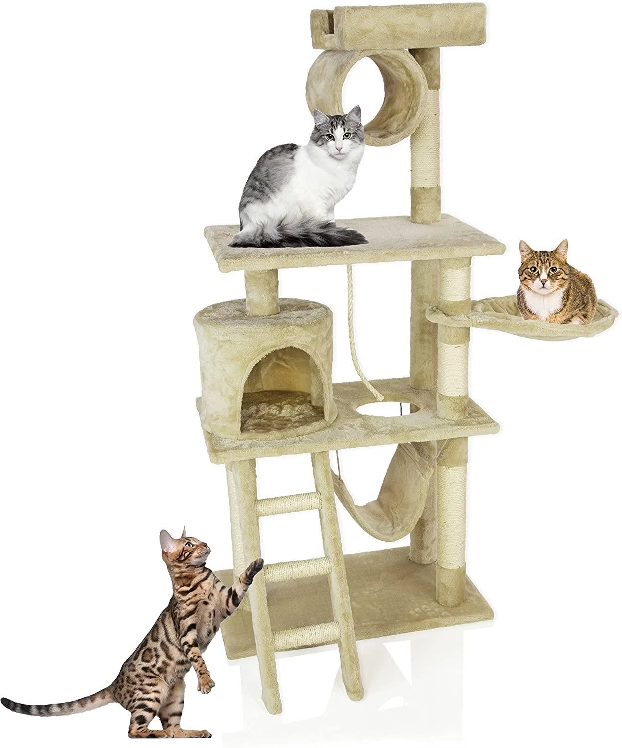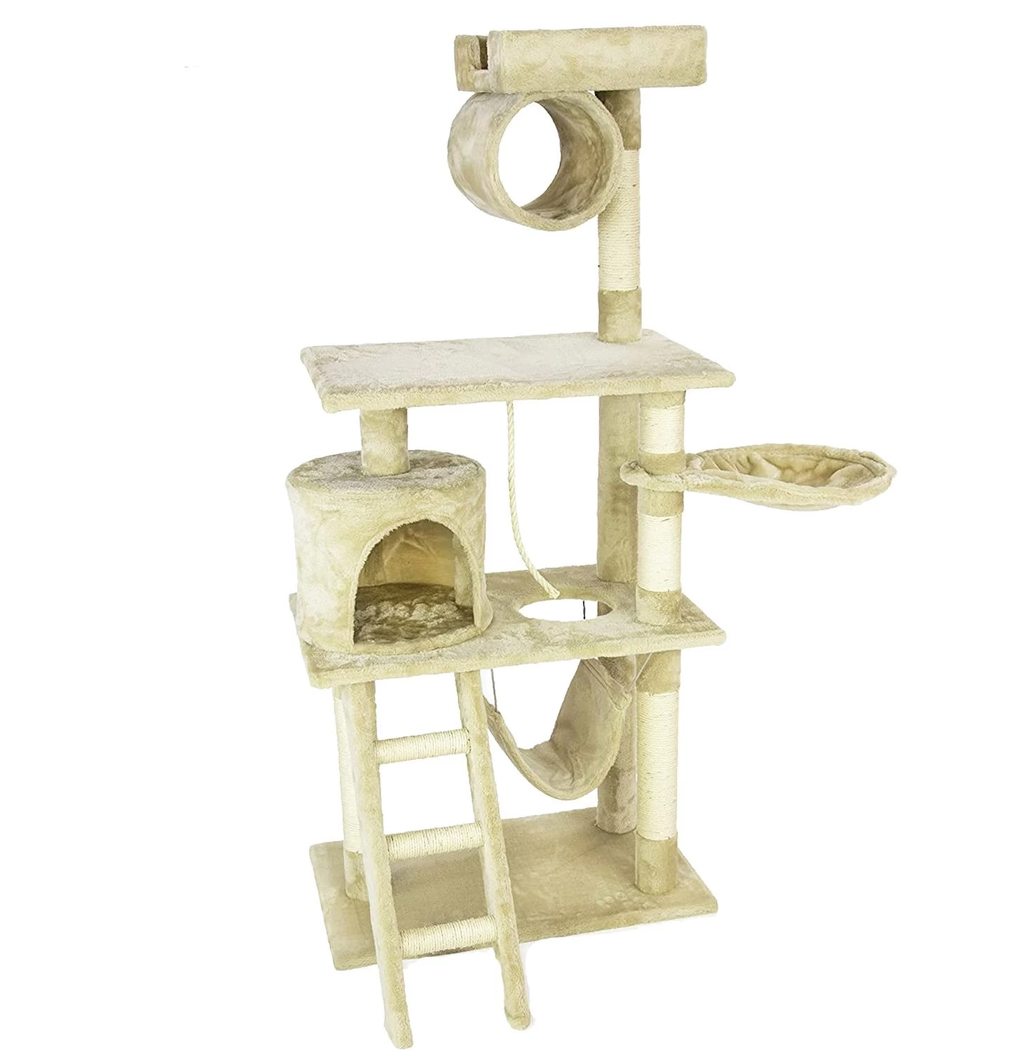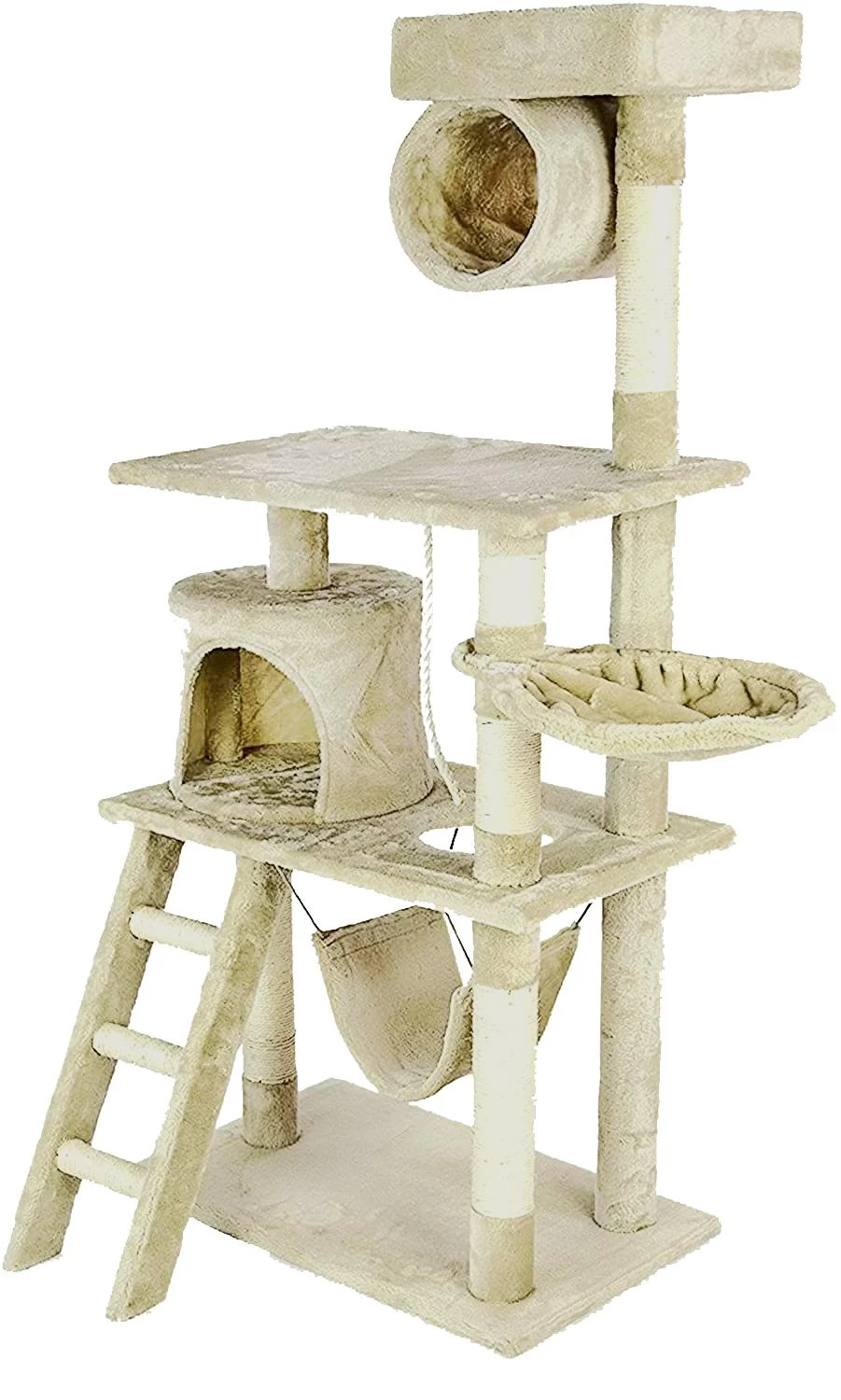 The CA&T Ultimate Scratch Tower Playground provides of a multitude of activities to keep your cat busy. Mid-sized at approximately 145 cm in height, there are two intermediary platforms, a nest sleeping platform, a top rest cylinder, top perch and the ultimate ‘lazy boy’ swinging hammock! To complete the CA&T Ultimate Scratch Tower Playground there is a chunky rope which hangs down centrally from the underside of the top platform to playfully tantalise your kitty cat. Made from high quality, environmentally friendly, non-toxic particle board covered in 350g faux fur soft plush in a beige colour material, the upright posts are coiled with top quality 4mm natural sisal which is great for sharpening those claws! Durable and sturdy, when constructed the CA&T Ultimate Scratch Tower Playground is approximately 145cm H x 60cm W x 40cm D in size. Supplied with installation instructions and fixings. Weight approximately 13.7 kgs.