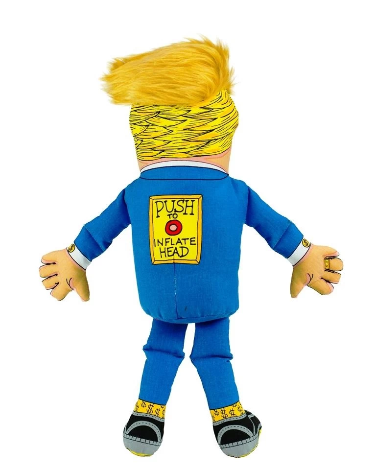 Fuzzu Donald Cat & Dog Toys bringing you Presidential Fun! Donald is super stylin’ with his golden tan, quaffed plush hair and flashy garb. Featuring top stitched floppy elbows and knees for active play and strategic posing…. A photo opportunity begging to happen. His well-heeled foot will inevitably end up in your pet’s mouth! Push the button on the back of his head and watch as it inflates before your very eyes! Three sizes available, one for your cat which is filled with organic cat nip and two for your dog, both having super loud squeakers inside. Sizes: Cat 8″ H x 4.5″ W x 1.25″ D. Dog Small 12″ H x 4″ W x 2.5″ D. Dog Large 17″ H x 7″ W x 3″ D.