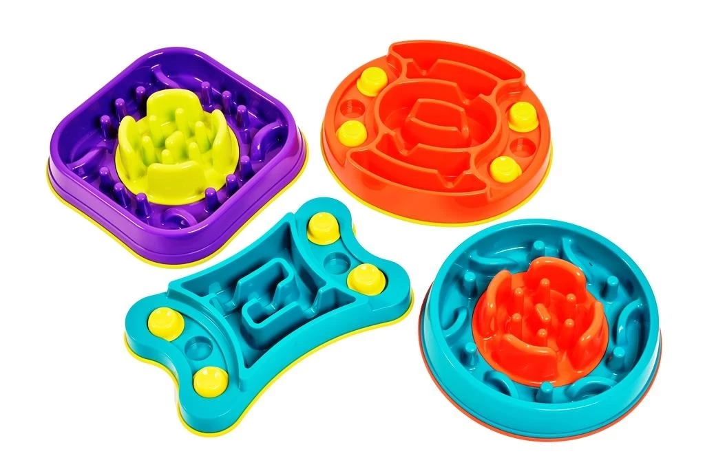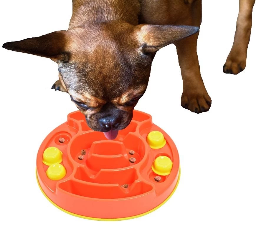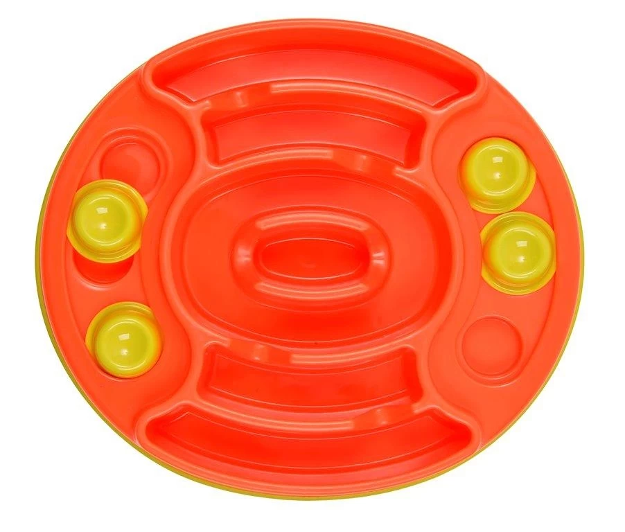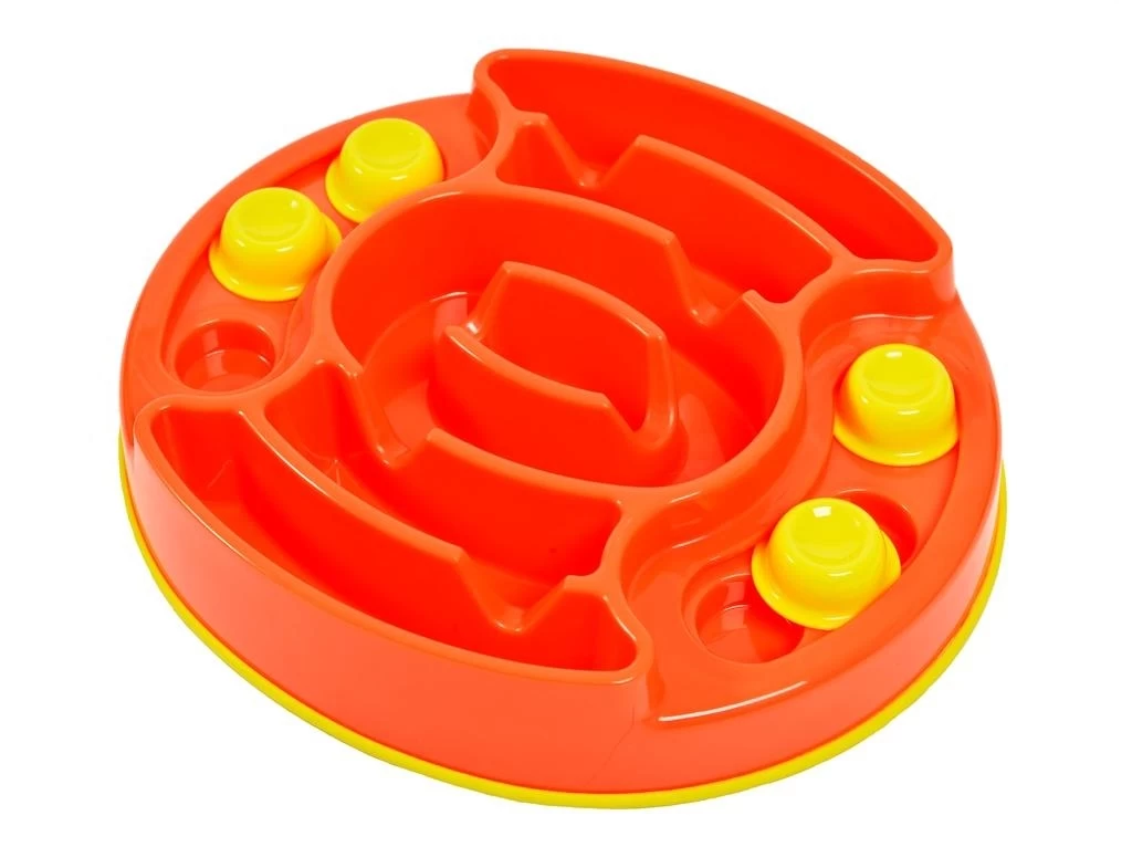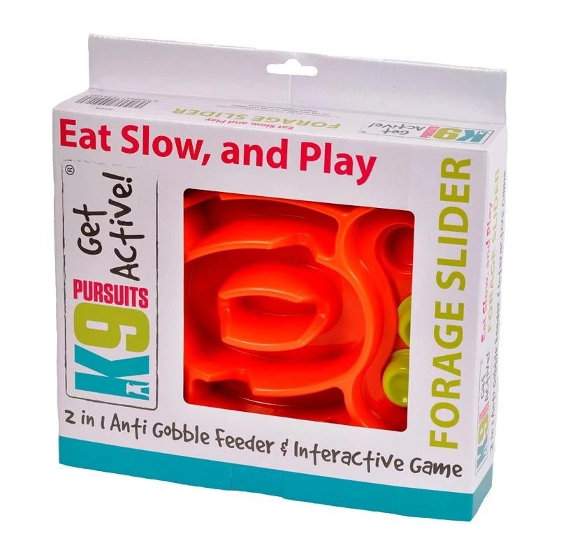 K9 Pursuits ‘Get Active’ range brings the first of its kind Forage Slider 2 in 1 Anti Gobble Slow Feeder and Interactive Game. For meal times, it has been designed as a practical slow feeding bowl which prevents your dog from gobbling and rushing their food therefore easing reflux, indigestion and bloat. For fun times to be used as boredom breaker and play. The Forage Slider has an added section on each side with apertures that are covered by cups that need to be nudged away to reveal their hidden yummy treasures making it even more of a challenge. Brought to you in fabulous Orange and Lemon colours, K9 Pursuits ‘Get Active’ the Forage Slider has an Anti-Skid base and is Dishwasher Proof, BPA, PVC and Phthalate free. Suitable for wet and dry foods, dogs or cats. A great combo game-feeder! Size: 7cm x 27cm x 31cm.