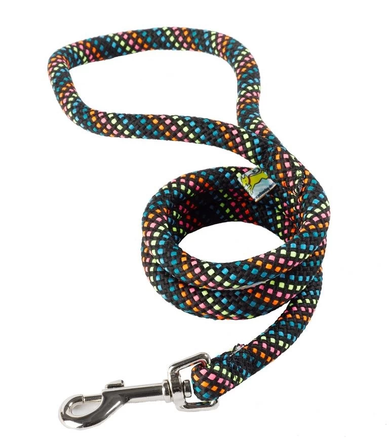 The funky, super cool Yellow Dog Design Multi Colour & Black Fluorescent Braided Lead 3/4″ Wide x 48″ Long is made from 100% colour-fast machine washable soft, springy yet durable polyester material and has metal, silver colour snap-hook fastener.  Made in North Carolina, America.