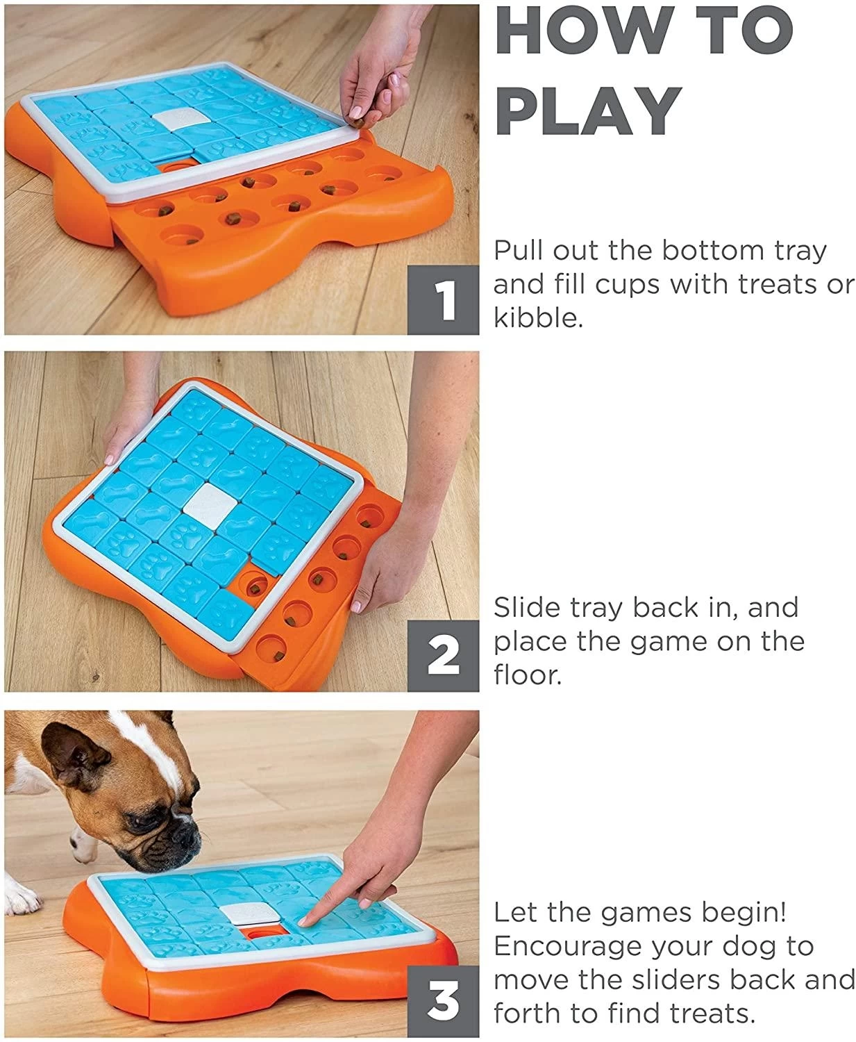 How to Play – Playtime Challenge – The ultimate exercise for learning and playtime, the Nina Ottosson Challenge Slider can be filled with treats to exercise your dog’s mind and strengthen the bond between you and your dog through interactive play. Let the fun begin! Always supervise play and do not allow your dog to chew the game. Remove if it becomes worn. Put away until next time.