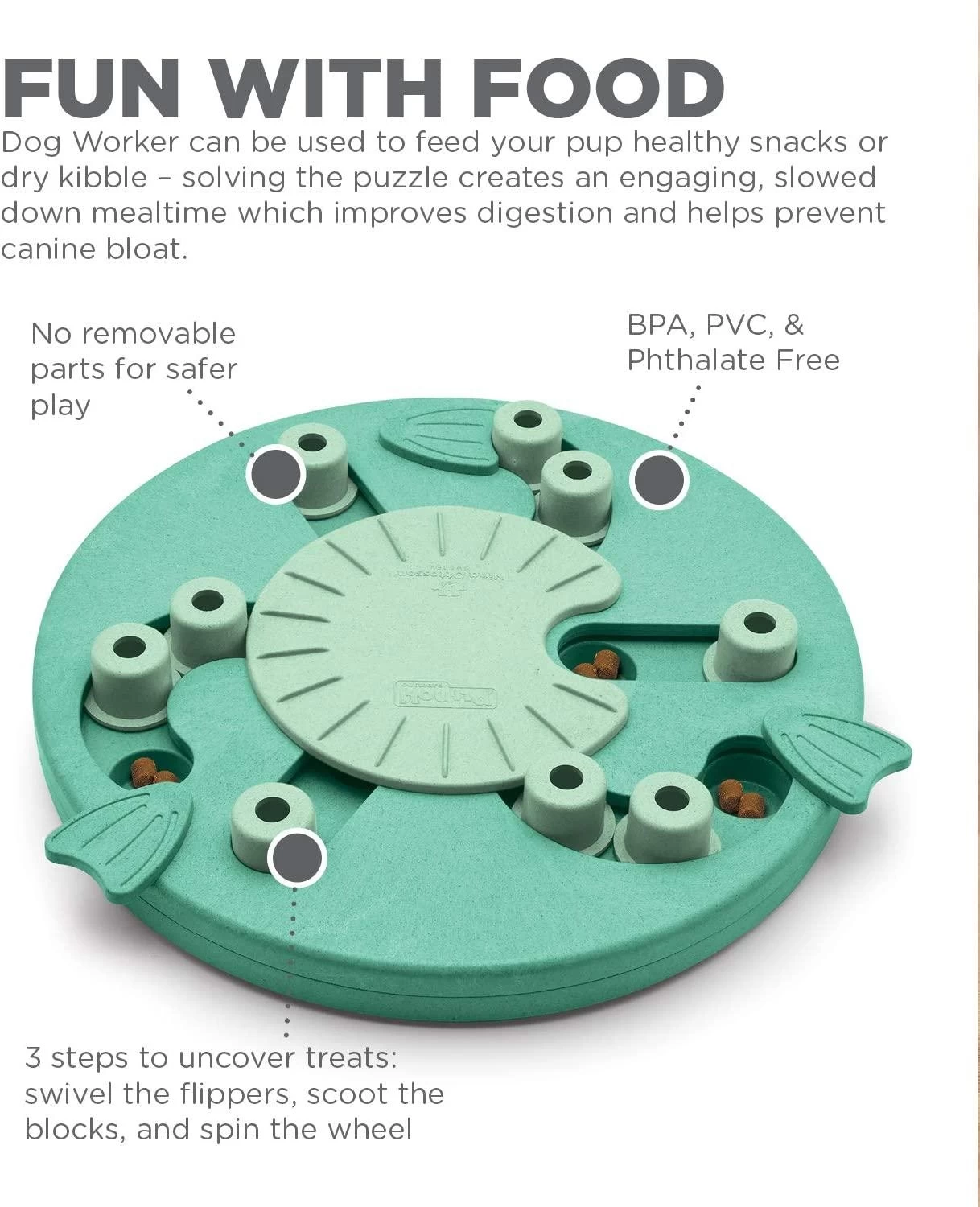 Easy to Clean – To wash your Nina Ottosson Dog Worker simply remove all treats and residue. Proceed to wash with warm soapy water, rinse clean and dry. BPA, PVC & PHTHALATE FREE.
