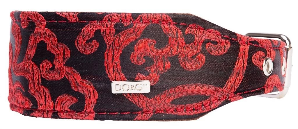 The DO&G Oriental Silk collection is confidently flamboyant. With accents of a mystical Far East, these ornate dog collars are made from only the finest Chinese silk and soft yet durable leather on the inside. This stunningly unique Dragon pattern is rich in colour and radiate a luxurious, high fashion feel.  To complete the look this dog collar has been finished using high quality, silver solid metal work that flatters the vibrant colour and pattern just perfectly. Sumptuously grand, this dog collar definitely is Catwalk Style!