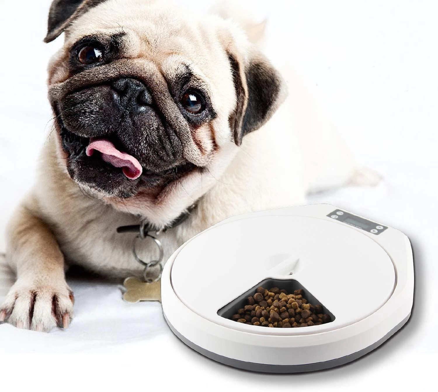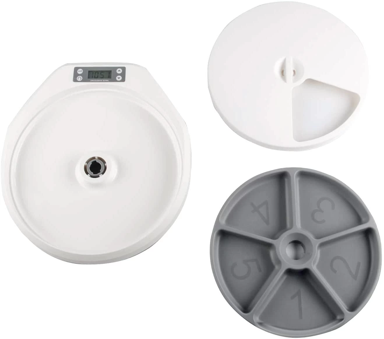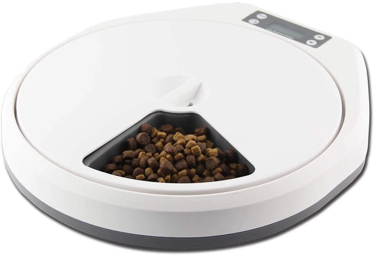 The PAWISE Automatic Pet Feeder 5 Meal allows you to schedule your pet’s meals in advance for convenience and peace of mind, especially if you are not going to be home in time. Easy to operate, fill the feeder trays with food and set the rotating time between two meals which can be between 1 minute and 23 hours and 59 minutes. For example, feed your pet 5 meals and rotate 4 bowls. Up to 5 meals every setting.  A great way to manage portion control if your pet tends to over eat. Holds 1 cup of food in each tray Made from BPA free plastics. The tray compartments are dishwasher safe. Uses 4 x AA batteries, not included. Size: 5.9 cm x 32.9cm x 36.9 cm.