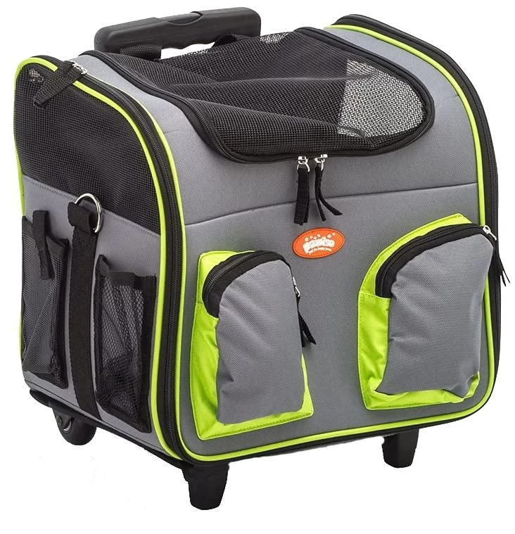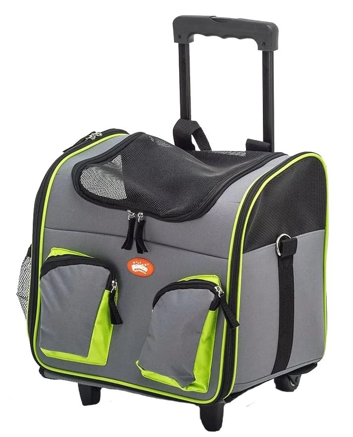 The PAWISE Pet Transporter Trolley is perfect for pets on the go! Well ventilated with mesh sections to both sides and the top section, the PAWISE Pet Transporter Trolley is spacious and roomy and your pet will be able to see the outside easily. Included inside is a cosy mat to relax on and an integral D Ring to attach your pet to for safety purposes if required. The top and left side section is zipped to be able to access the inside of the trolley and there are two zipped pockets to the front to stow those travel essentials. Also included are two mesh pockets to the left zipped side. To either side are two integral D Rings to enable the Trolley to be secured safely whilst in transit if necessary. To complete the PAWISE Pet Transporter Trolley has four wheels to the bottom for easy and smooth movement, a telescopic handle to pull or push the Trolley and reflective accents for high visibility. Size: 37cm x 27cm x 33cm. Colour Grey.
