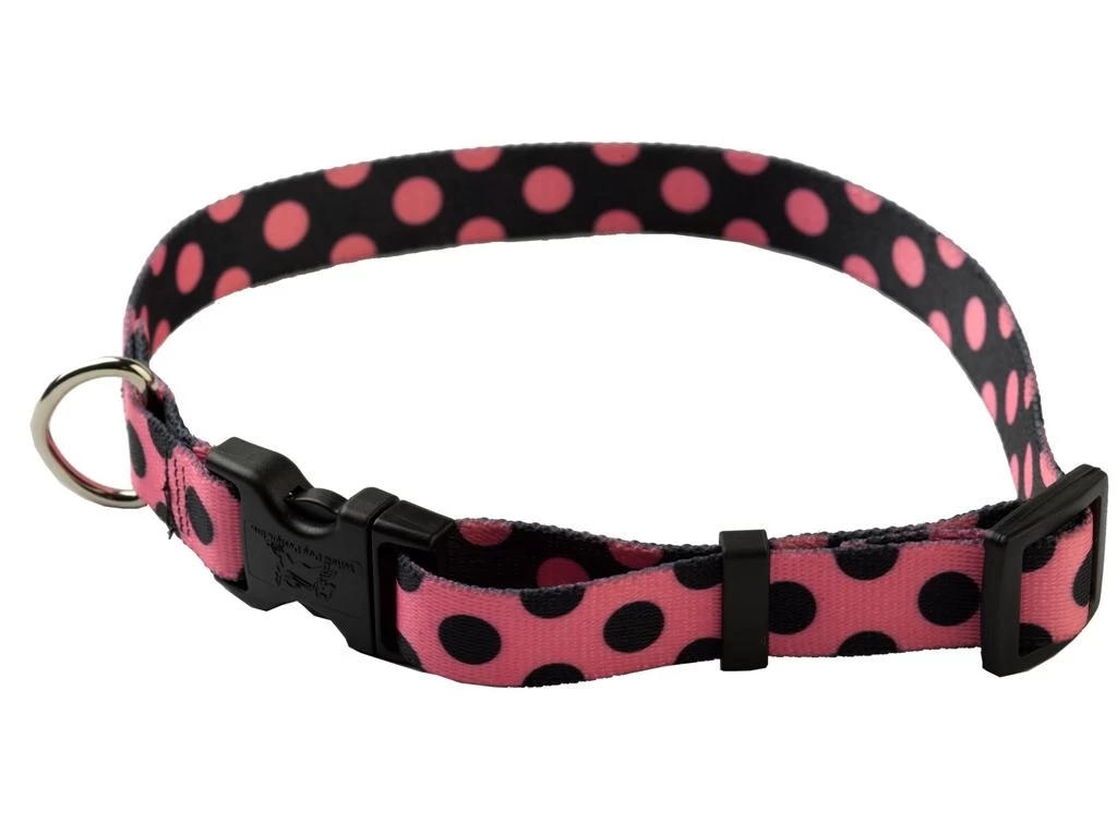 A classic retro bold polka dot print, but the neon pink of this collar ensures that your pampered pooch will stay bang on-trend. Made in the USA by Yellow Dog Design, this collar comes with durable plastic fast release clip, plastic slip locks, and a metal D-ring.  Crafted from durable, washable polyester. Why not complete the look with a matching Pink & Black Polka Dot Lead from this range?