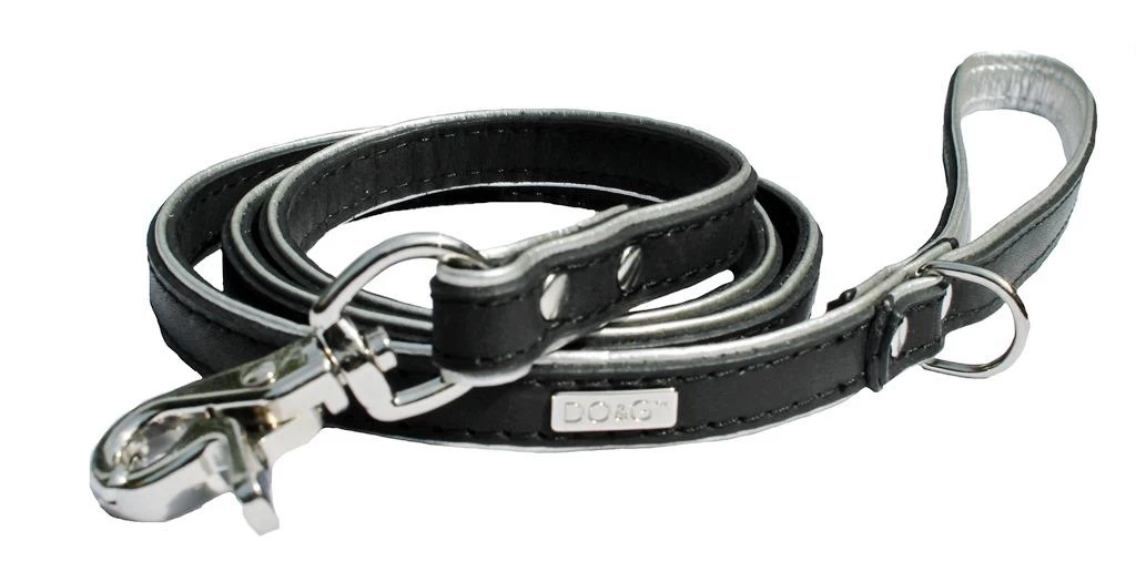 The DO&G Precious Lead in Jet Black has a Silver colour lining running down each side and is absolutely stunning! Hand made to a high quality finish, this uber-high fashion dog lead is a must have for your smart & stylish pooches wardrobe. It doesnât just look good, it feels good too.  Made from leather, the inner padding is of sheep skin making this high quality lead feel so soft to the touch but also durable and hard wearing.  There is also a D Ring fitted just below the handle to attach any accessories you may wish to.  Finished with matching Gold high quality metal work and DO&G branding tags.  There also matching collars available here â Precious Metals or Precious Stones