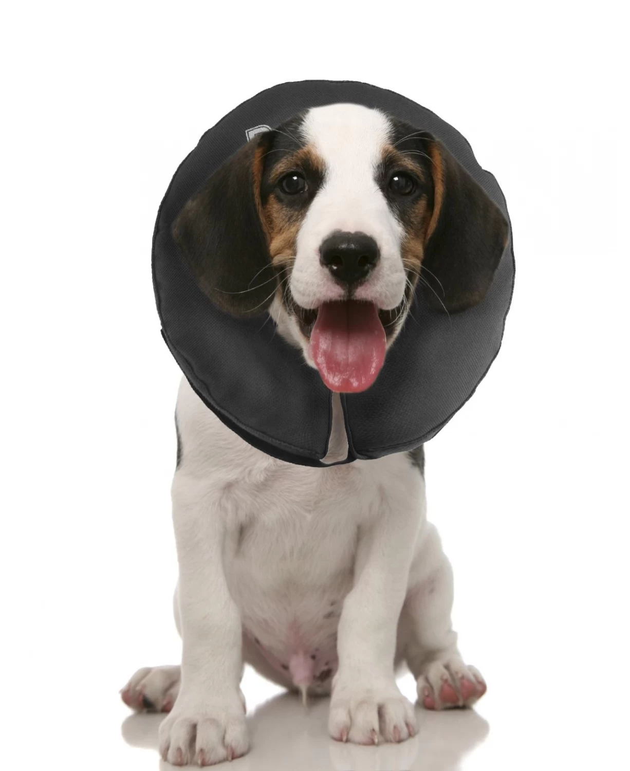 ProCollar Premium Recovery Collar for dogs and cats.  This unique product has been designed to replace the traditional Elizabethan (lampshade) collar which now firmly belongs back in the era from which which they were named after.  The ProCollar does not block your dog or cat’s vision and allows your dog or cat to stay protected after post-surgery wounds, injuries or rashes whilst being able to resume normal everyday activities such as eating, sleeping and having fun! The ProCollar has an inflatable inner tube that is inflated through a two-way air valve. Once inflated, the ProCollar works a soft deterrent and almost becomes a portable recovery pillow! The inner tube is protected by a machine washable, lightweight and breathable yet durable canvas cover that resists bites and scratches. The ProCollar is held in place by inserting your dog or cat’s everyday collar through the three inner rings and then Velcro straps can be adjusted for a perfect fit.