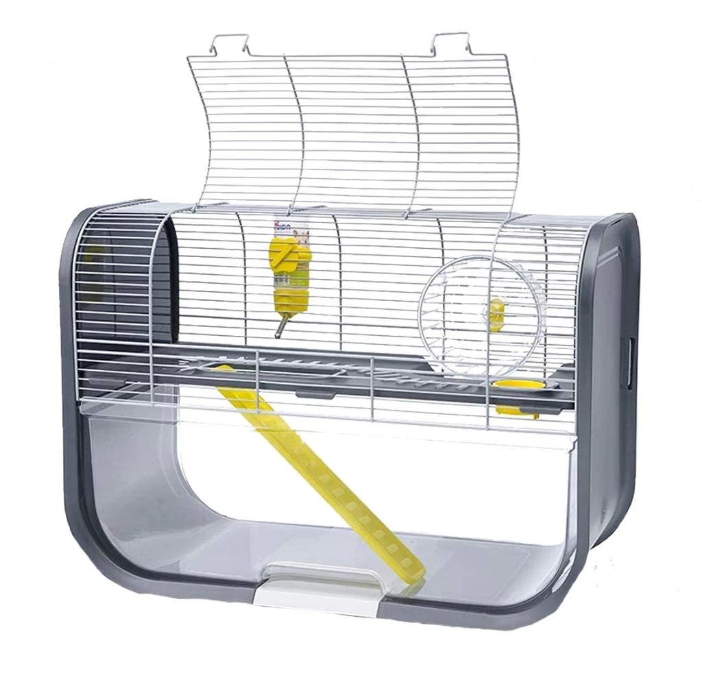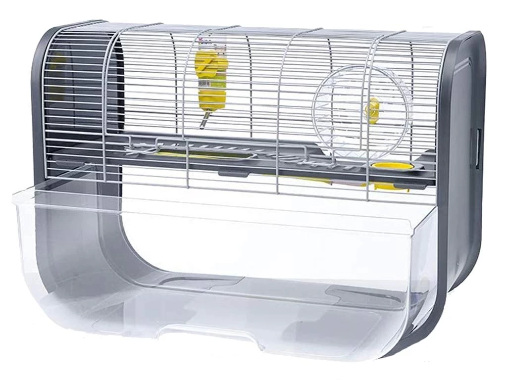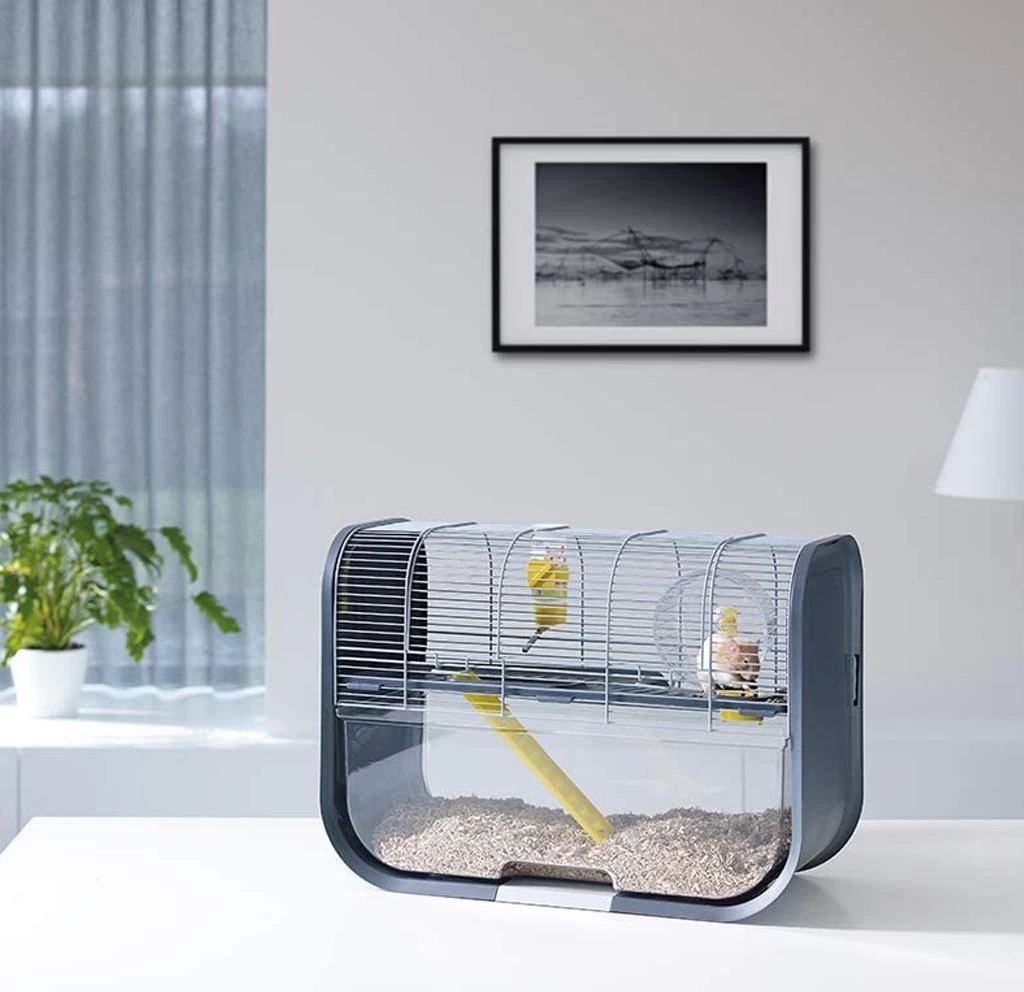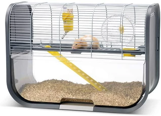 The Savic Geneva is an ultra modern, trendy two storey hamster home in solid grey. The large play area in the base allows your pet to hide, burrow and tunnel to their heart’s content whilst the platform above, supplied with a ladder for access, is a perfect area for rest and re-fuelling. The wheel, water bottle and feeding bowl are fitted to the inside of the wire cage in suitable positions. Cleaning is made super easy as the base slides out and the upper part of the cage can be closed off to keep your furry friend safe and secure. There is also a access via a wire cage door to the top centrally.