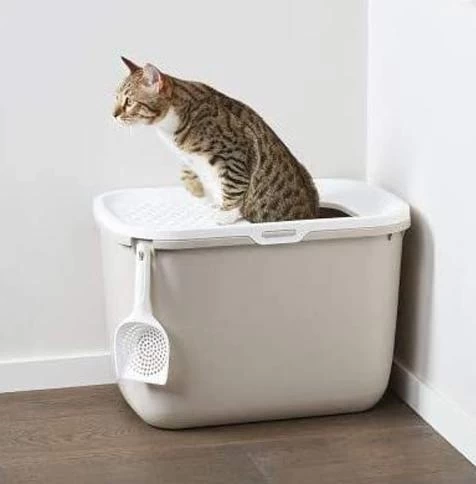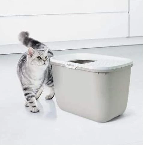 The Savic Hop In Litter Box is an innovative top entry litter box with a spacious area inside incorporating the tray area. Ideal for larger cat breeds, the high edges makes it particularly suited to cats that are prone to moving the litter around vigorously and ensures that the content remains inside until emptied thus making mess in the surrounding tray area minimal. The top entry/exit section is a good size at 24cm x 22cm and is housed within the removable lid which is perforated ensuring that upon exit, any loose debris attached to your cat’s feet or fur fall back down into the box through the holes. Easy to clean; the removable lid can be hung on the side to make it super easy to access, grip handles underneath makes lifting and emptying a breeze and there is a hook on the outside of the box to hang the litter scoop. A great solution for any household but perfect for those that have limited space. Colour: Mocha & White. Size: L58.5cm x W39cm x H39.5cm.