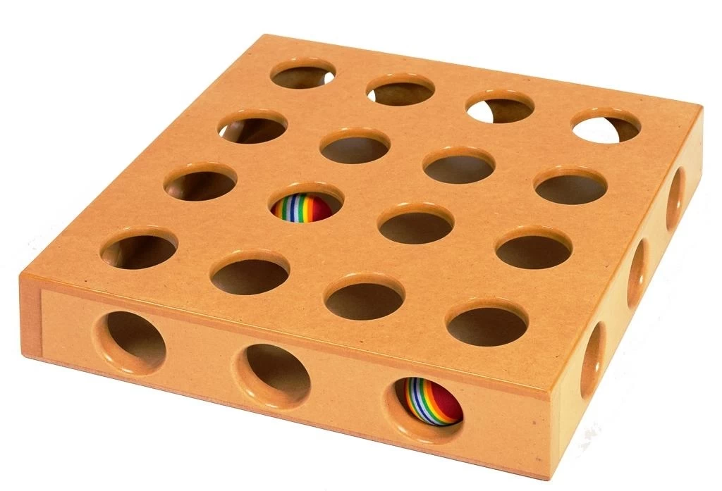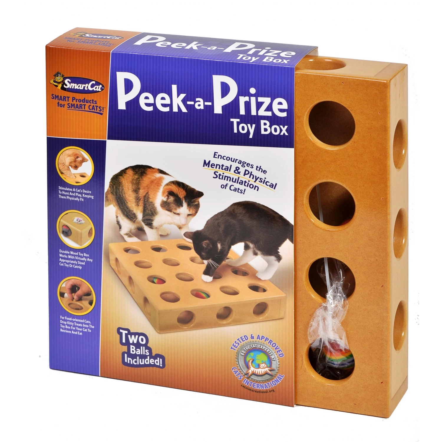 SmartCat Peek A Prize Toy Box is a great toy for your kitty! The SmartCat Peek A Prize Toy Box will drive your cat or kitten wild with excitement as it provides opportunities for stalk like, ambush play! Complete with two toys, your cat can peek through the holes and crevices and make their planned pounce.  Add more toys for even more fun. Made from varnished heavy duty MDF the Peek A Prize Toy Box is heavy enough to withstand the most vigorous attention. This really is a fantastic boredom buster and stimulates problem-solving, enquiring mental and physical exercise which will keep your cat amused for hours.