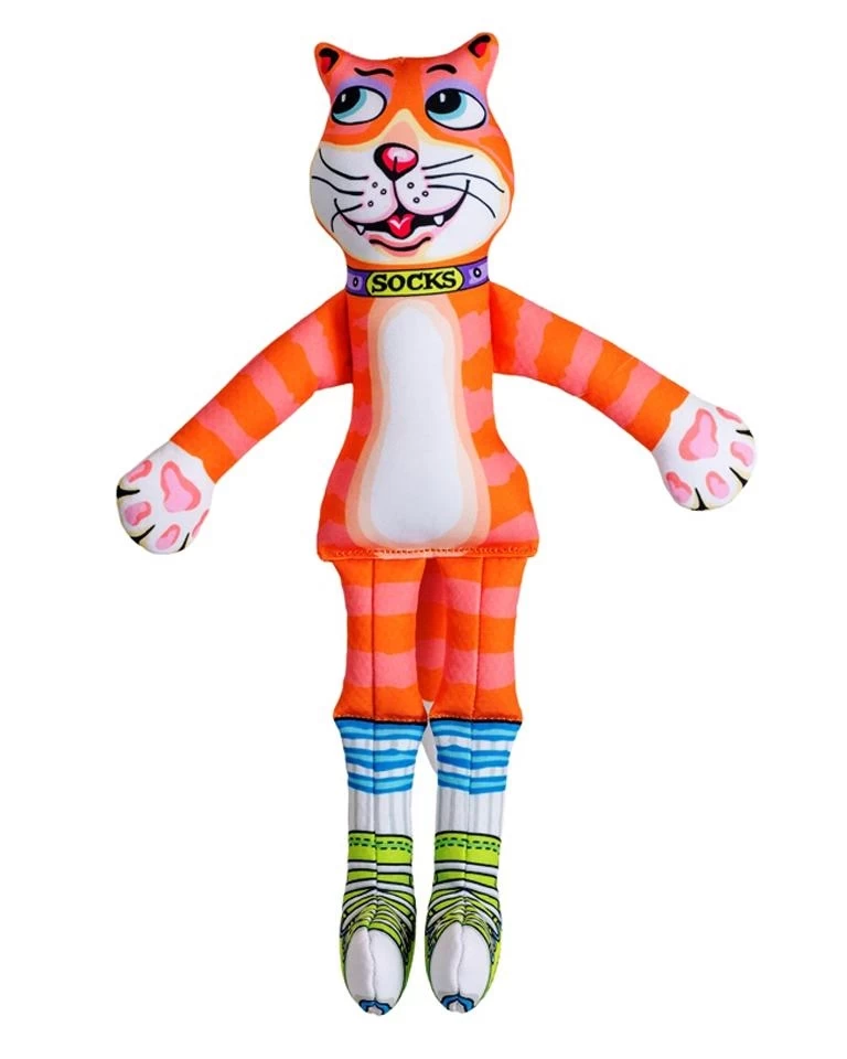 That Sneaky Cat! range of dog toys by Fuzzu. Socks is fabulously floppy! This leggy dude with high-tops and tubes will score big with your pup. Floppy by design, a very exciting thing if you are dog! Socks is a slam dunk choice. Key seams are triple stitched for durability and a squeaker inside is just the thing to keep the party going. Socks is available in two sizes. Medium 14.5″ H x 5″ W. Large 24″ H x 9.5″ W.