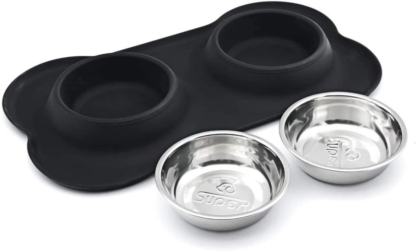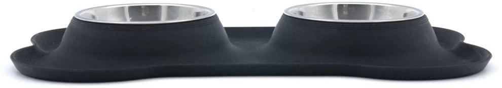 The Super Design Double Pet Bowl & Silicone Mat for Dogs and Cats comprises of a food grade silicone bone shaped mat with raised edges which help to contain any liquid or particles of food that have spilled out of the bowls. The anti-slip silicone mat also provides stability and will stay put on floor surfaces preventing any movement of the bowls either empty or full. The two removable bowls are made from food grade stainless steel. Practical and stylish, both the silicone mat and the stainless steel bowls are easily cleaned with a soft cloth or alternatively are dishwasher safe. Available in 3 colours, Black, Blue & Orange & 3 sizes, Small and Medium. See Sizing below.