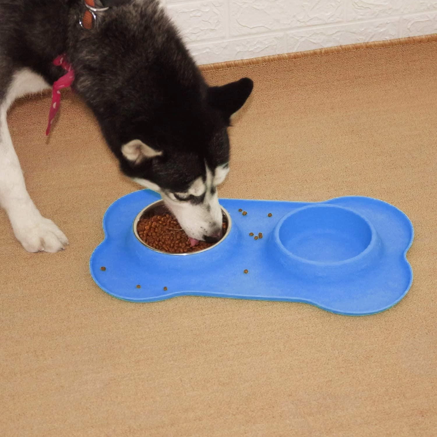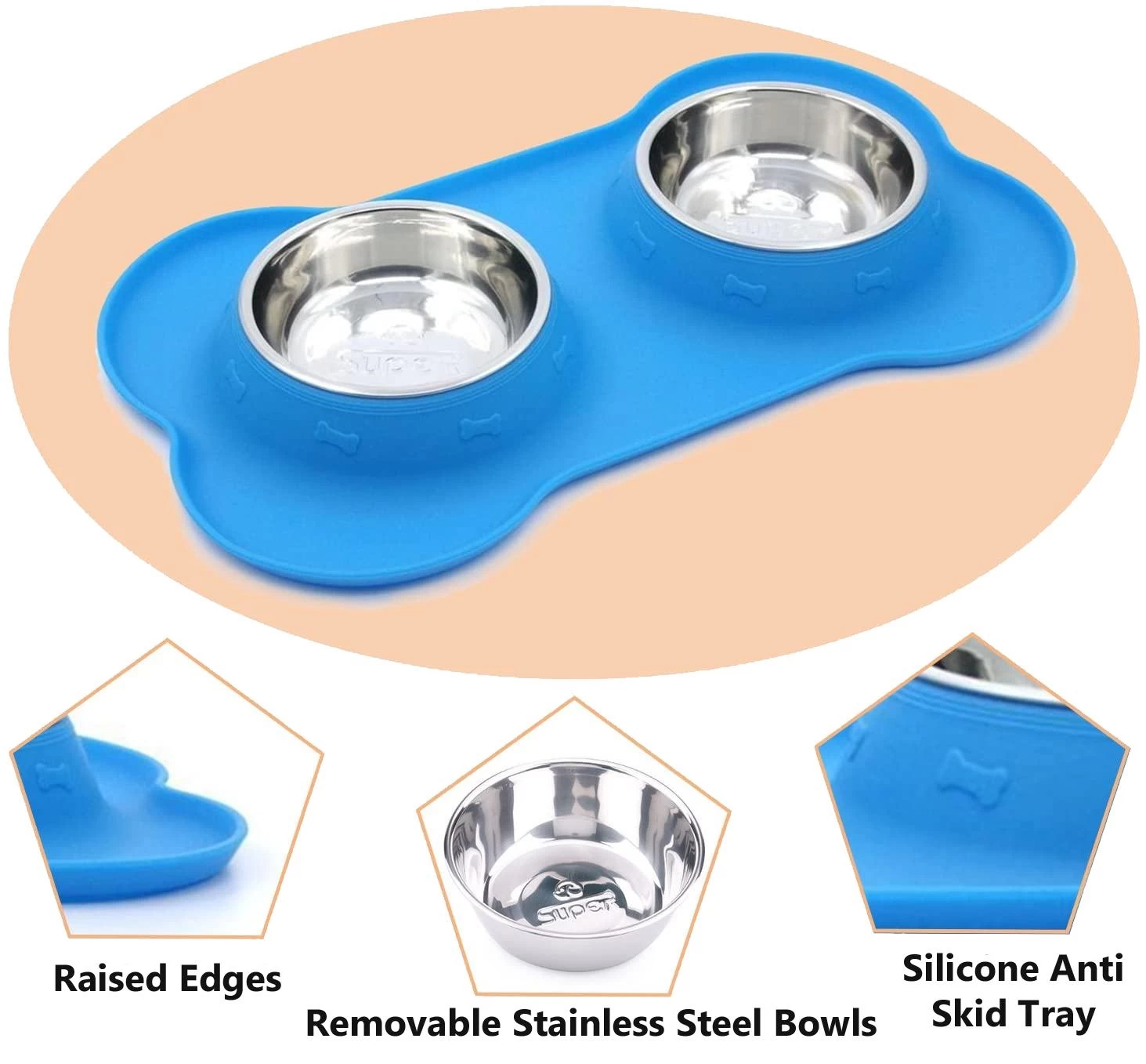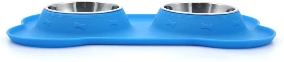The Super Design Double Pet Bowl & Silicone Mat for DogsĀ andĀ Cats comprises of a food grade silicone bone shaped mat with raised edges which help to containĀ any liquid or particles of food that have spilled out of the bowls. The anti-slip silicone mat also provides stability and will stay put on floor surfaces preventing any movement of the bowls either empty or full. The two removable bowls are made from food grade stainless steel.Ā Practical and stylish, both theĀ silicone matĀ and the stainless steel bowls are easily cleaned with a soft cloth or alternatively are dishwasher safe.Ā Available in 3Ā colours, Black, Blue & Orange & 3 sizes, Small and Medium. See Sizing below.