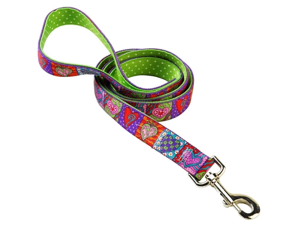 You are guaranteed to fall in love with this gorgeous colourful heart printed Uptown Luxury Lead! From Yellow Dog Design in the USA, this luxury lead features a decorative patchwork heart print in vibrant shades of purple, green, red and orange with a contrasting green and white polka dot print on the inside lightweight padding.  Made from 100% high quality colourfast polyester, this eye catching Uptown lead is finished off with a high quality strong metal D-ring fastener.  Team up with the matching Uptown Crazy Hearts Collar for a fantastic, playful yet practical addition to your pampered poochâs wardrobe.